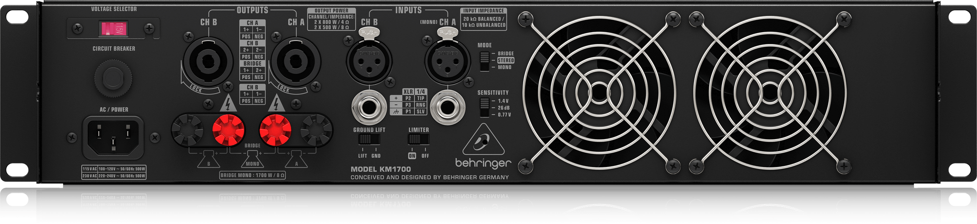 - 2 x 800 Watts into 4 Ohms; 2 x 500 Watts into 8 Ohms; 1700 Watts into 8 Ohms (bridge mode)