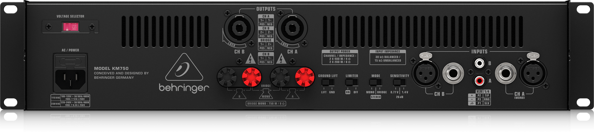 - 2 x 400 Watts into 4 Ohms; 2 x 200 Watts into 8 Ohms; 750 Watts into 8 Ohms (bridge mode)