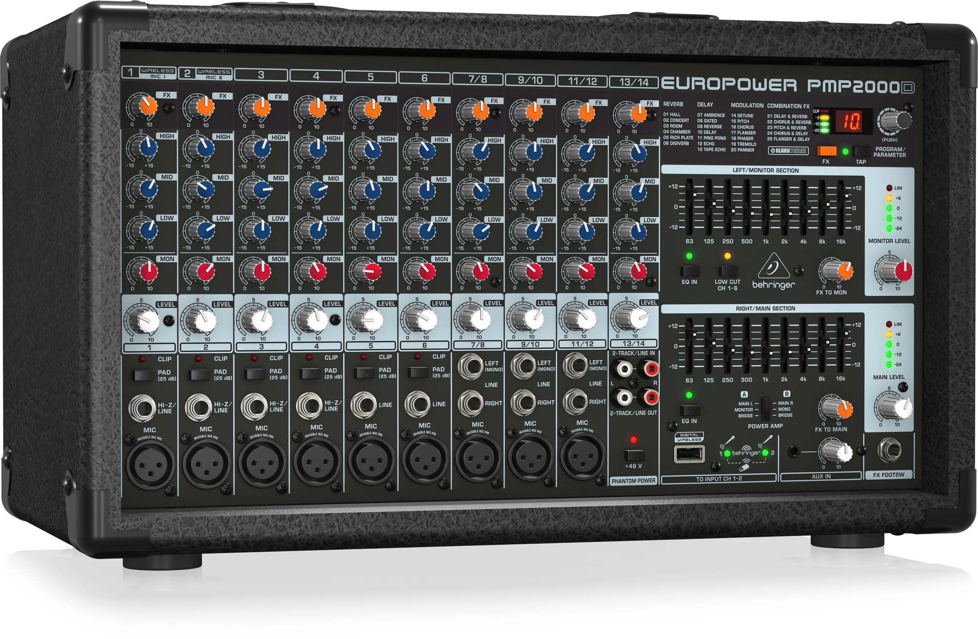 - 14-channel mixer section features 6 mono and 4 stereo channels