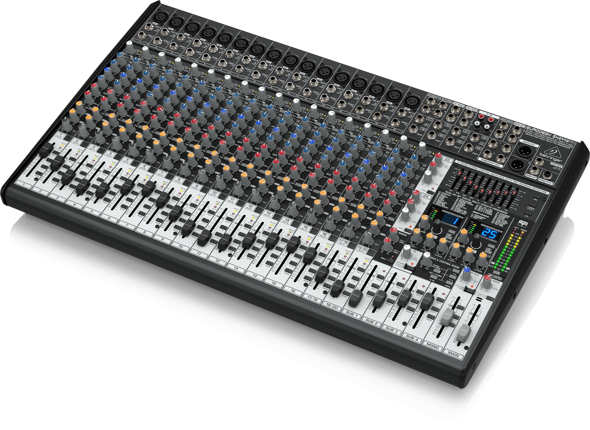 - Inserts on each mono channel and main mix for flexible connection of outboard equipment