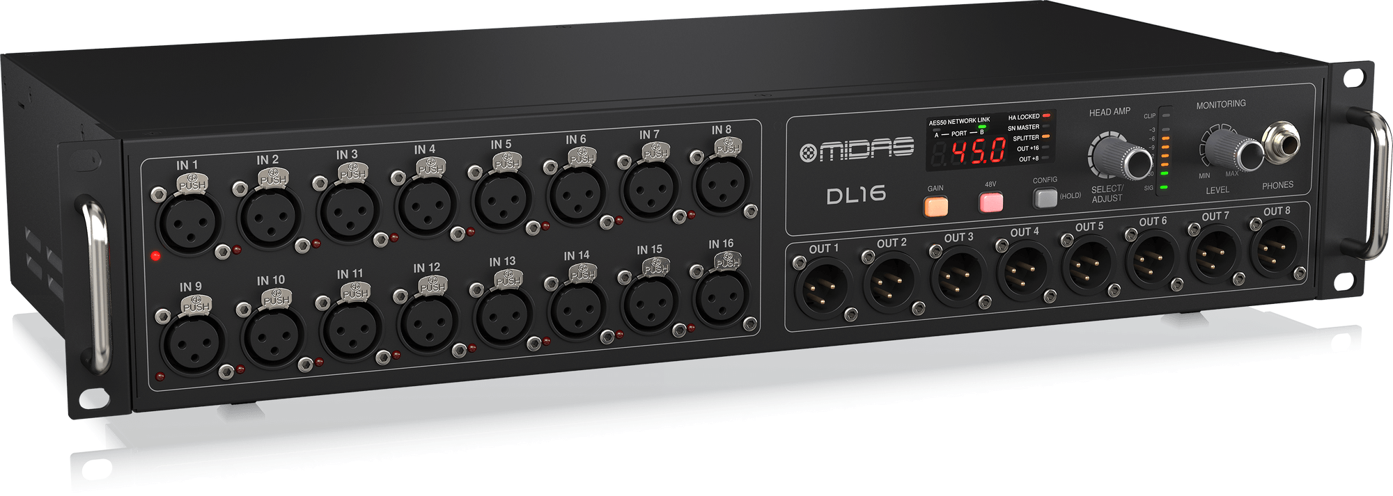 - 16 award-winning Midas PRO microphone preamplifiers with switchable 48 V phantom power